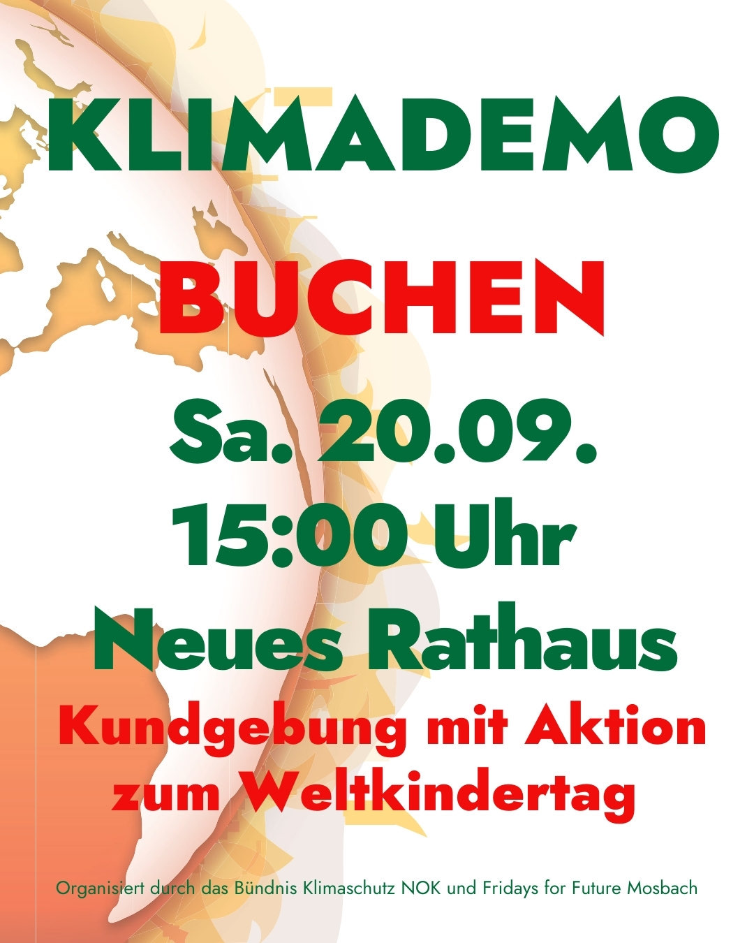 Demo und Aktionen zum Weltkindertag am 20. September in Buchen 17. September 202517. September 2025 Buchen. Am Samstag, den 20. September um 15 Uhr, findet vor dem neuen Rathaus in Buchen eine Klimademonstration mit buntem Aktionsprogramm zum Weltkindertag statt. Unter dem Motto „Klimagerechtigkeit ist Kinderrecht“ rufen Fridays for Future Mosbach und das Bündnis Klimaschutz NOK zu einem solidarischen und generationengerechten Wandel auf. Im Zentrum stehen die Rechte von Kindern und Jugendlichen – insbesondere derjenigen, die von Armut, sozialer Ungleichheit und den Auswirkungen der Klimakrise besonders betroffen sind. Klimagerechtigkeit ist Kinderrecht Redebeiträge gibt es u.a. von Frank Hemberger, Schulleiter der Nardini-Schule und Leitungskraft am Erzbischöflichen Kinder- und Jugendheim Walldürn und Till Neemann (18 Jahre) von Fridays for Future Mosbach.Frank Hemberger wird die enge Verbindung zwischen Klimaschutz, Kinderrechten und sozialer Gerechtigkeit herausstellen. Er warnt: „Wenn wir beim Klimaschutz versagen, verschärfen sich soziale Ungleichheiten massiv – besonders für junge Menschen in Jugendhilfeeinrichtungen.“Till Neemann spricht über Generationengerechtigkeit – sowohl in der Klimapolitik als auch im Rentensystem. Er fordert mutige politische Entscheidungen im Sinne zukünftiger Generationen und betont: „Unsere Zukunft darf nicht weiter aufgeschoben werden.“ Musik & Aktionen zum WeltkindertagDie neue Fachbereichsleiterin Gesang an der JMK Musikschule Helen Kemmerer wird mit Liedbeiträgen den Nachmittag bereichern. Sie singt begleitet von Horst Berger u.a. von Dota Kehr, Keine Zeit: „Ein begrenzter Planet und unendliches Wachstum, dass das nicht geht ist doch trivial. Jetzt Verzicht oder später Vernichtung – Ist das echt eine schwierige Wahl?Jahre des Zögerns man kannte die Fakten und war nicht bereit. Aber jetzt können wir nicht mehr warten. Jetzt ist Schadenbegrenzung noch möglich. Doch dafür muss sich sehr vieles ändern – Und jetzt fängt es an.“Dota Kehr – Keine Zeit Anlässlich des Weltkindertages wird es Angebote für Kinder und Familien geben: Der Spieleanhänger des Pflegedienstes Hand in Hand sorgt für Spiel und Spaß. Das Jugendbüro des katholischen Dekanats Mosbach-Buchen bietet eine Mitmachaktion zum Thema Nachhaltigkeit: Kinder können Samenbomben basteln – eine kreative, umweltfreundliche Bastelaktion zum Mitnehmen.